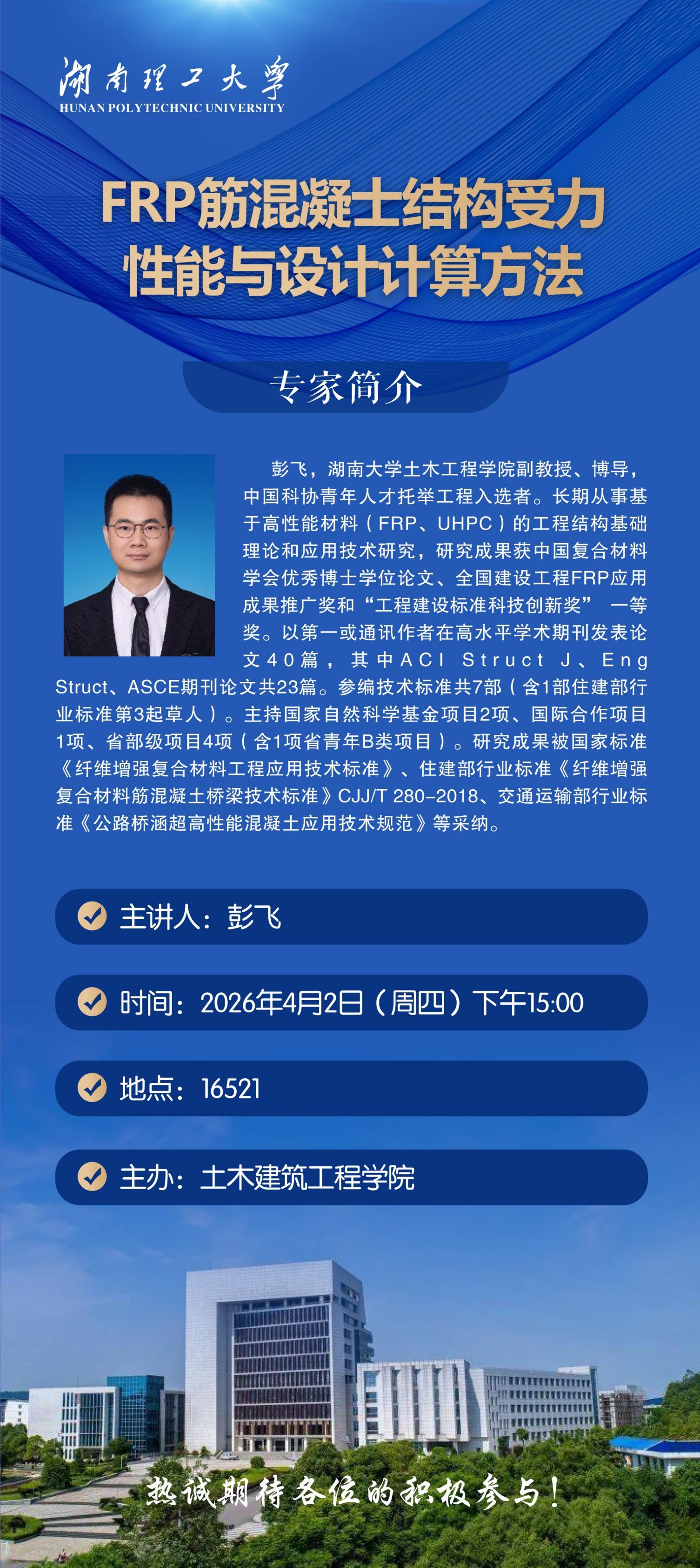 【学术讲座预告】湖南大学彭飞教授“FRP筋混凝士结构受力性能与设计计算方法”讲座预告